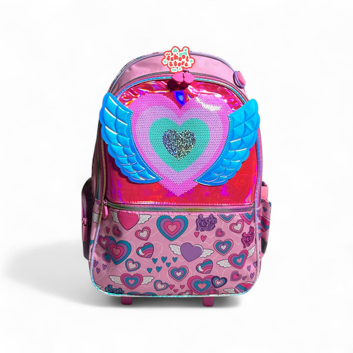 Experience the magic of our 17 inch Heart Trolley School bag by vest This trolley bag 2 main zipped compartments and 1 front zipped compartment plenty of space for books, stationery, and more, this bag effortlessly transforms into a convenient and easy-to-wheel trolley bag! The sturdy frame ensures durability and functionality.