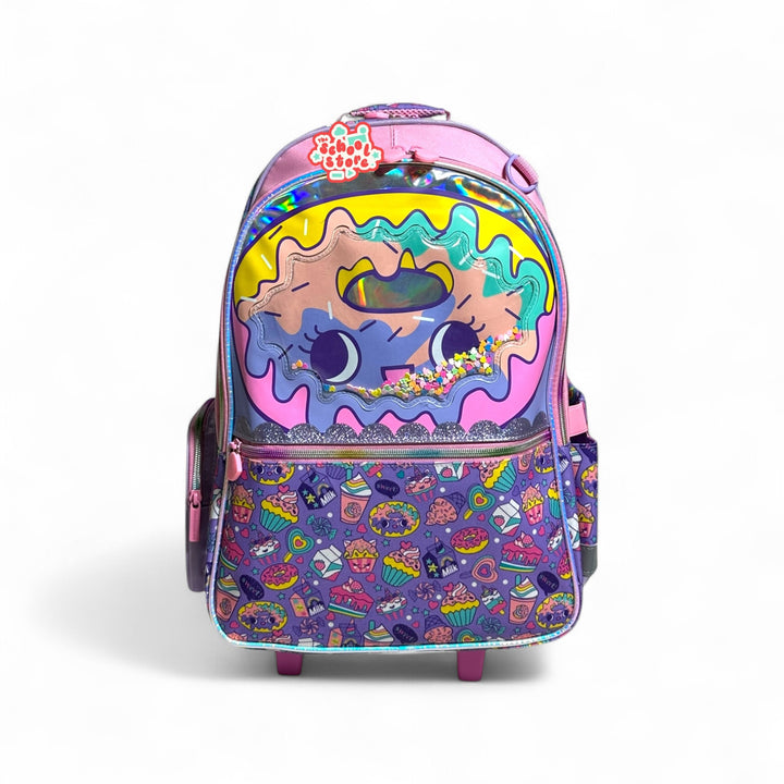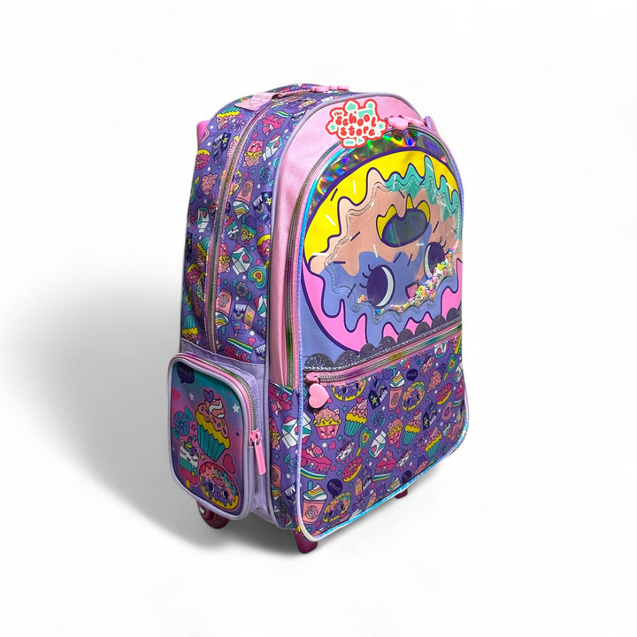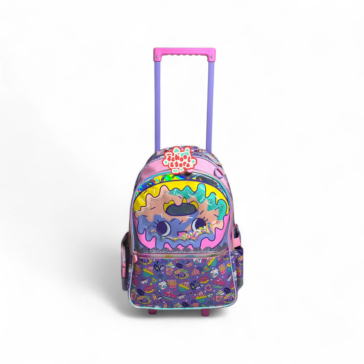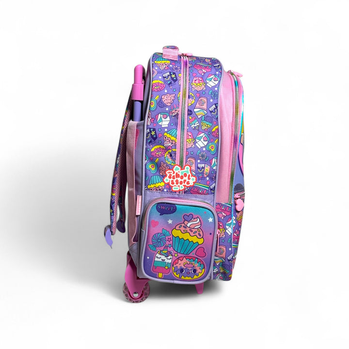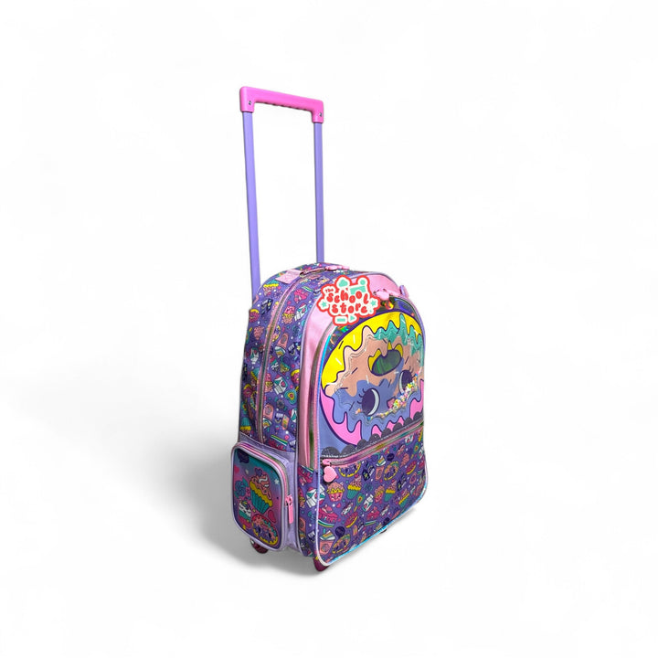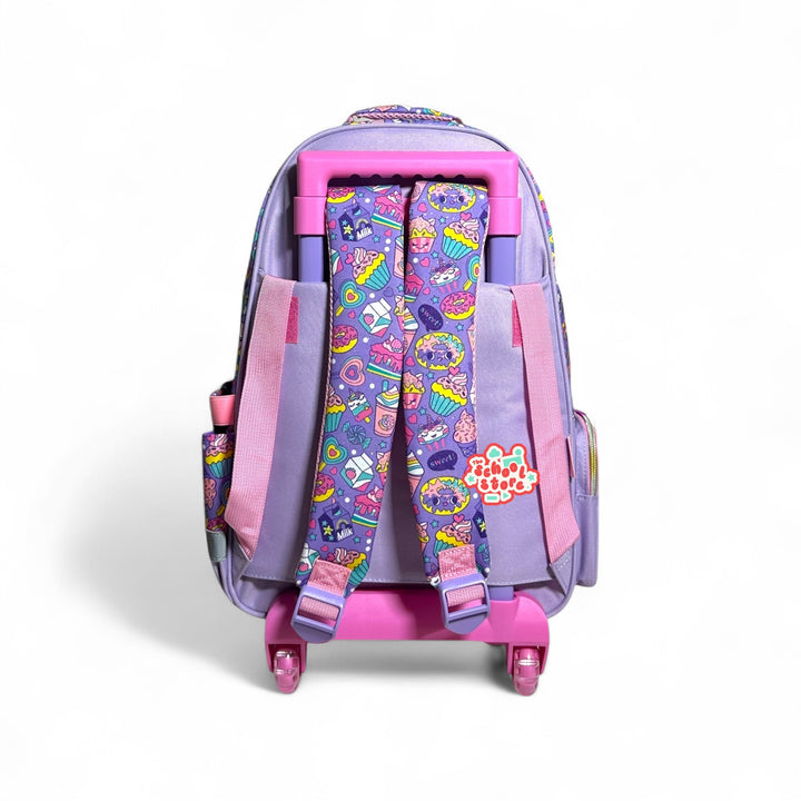 Experience the magic of our 17 inch cup cake Trolley School bag by vest This trolley bag 2 main zipped compartments and 1 front zipped compartment plenty of space for books, stationery, and more, this bag effortlessly transforms into a convenient and easy-to-wheel trolley bag! The sturdy frame ensures durability and functionality.