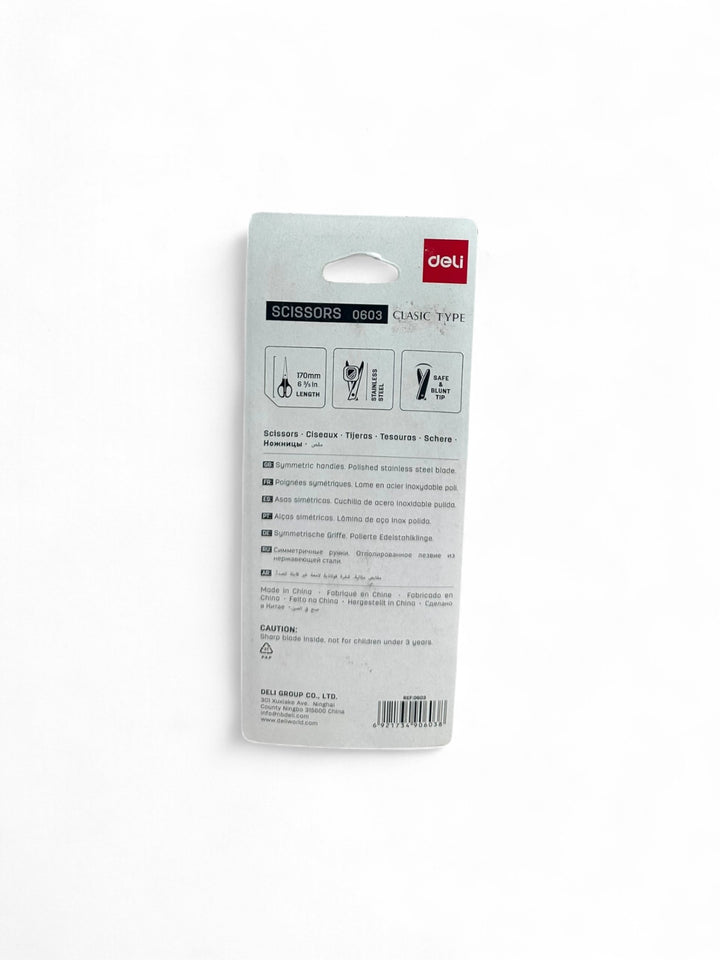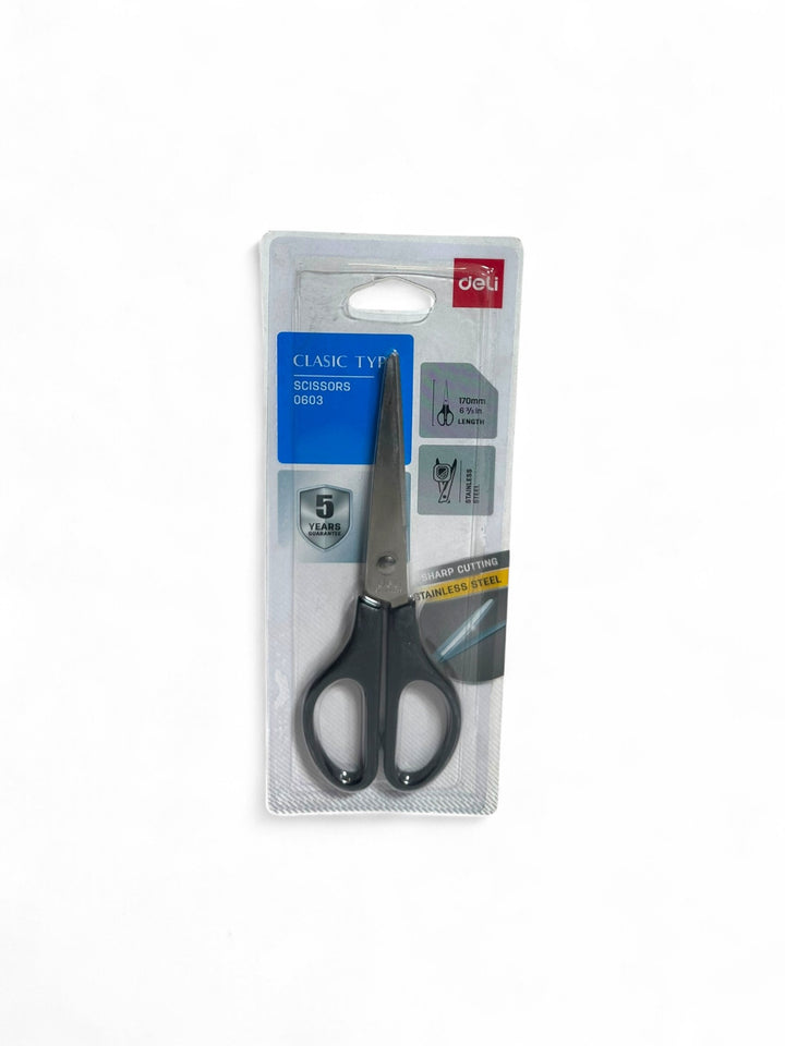 This is a Deli Classic 0603 scissors Soft-touch Scissors Made of stainless steel with a soft-touch handle for a comfortable grip. The blades are sharp and durable, suitable for cutting paper, fabric, and other materials. The scissors are 7 inches (170mm) in length.