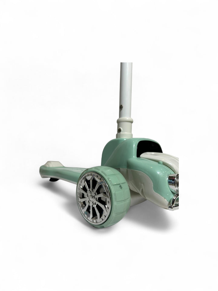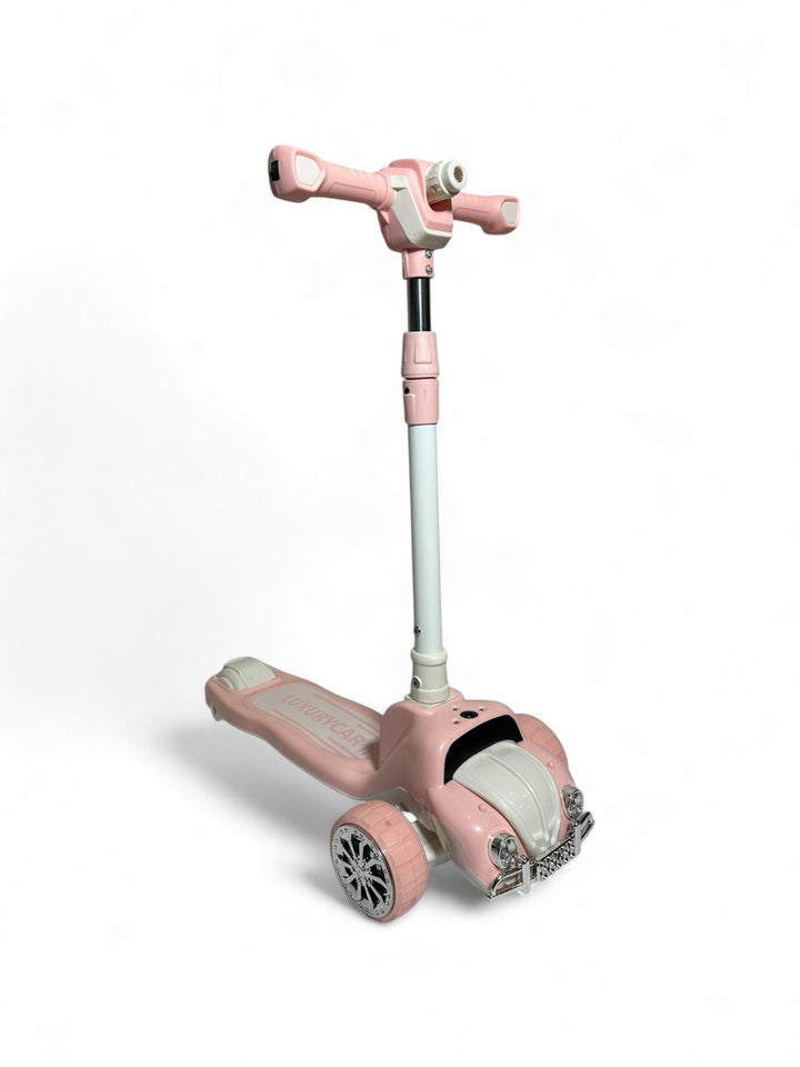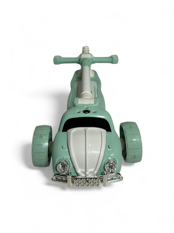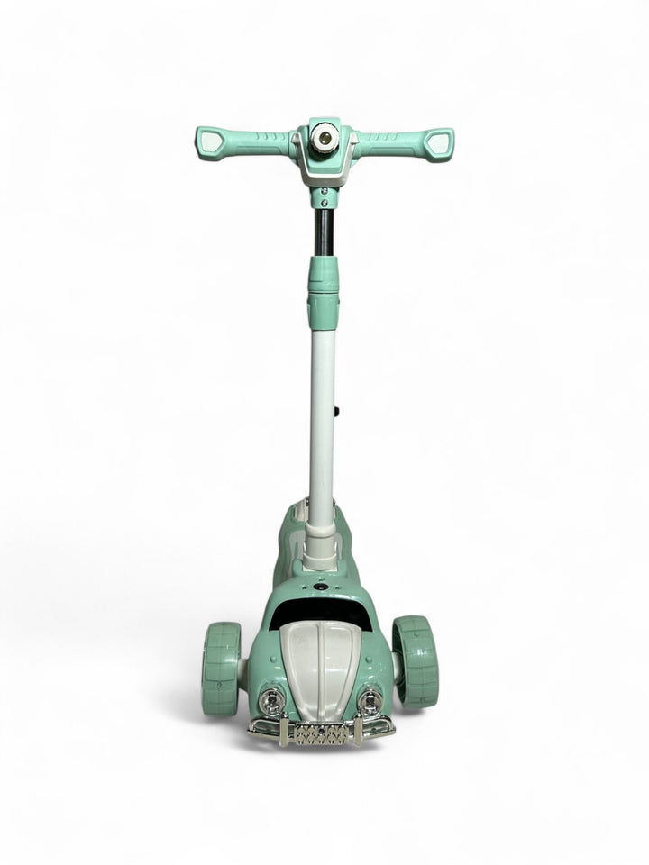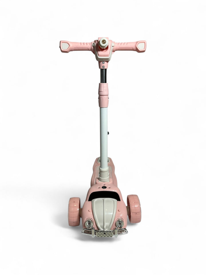 This a three-wheeled kids' scooter with a design resembling a classic car, specifically a Volkswagen Beetle. Features a car-like front, likely inspired by a classic car, and three wheels for stability. Often includes LED light-up wheels and adjustable handlebars to accommodate growing children. Designed with stability in mind, typically featuring a sturdy frame and anti-slip footrests. Suitable for young children, commonly in the 3+age range.