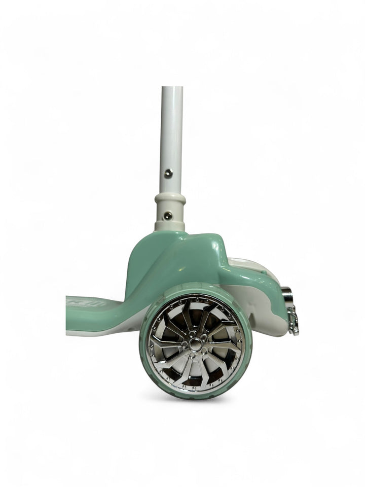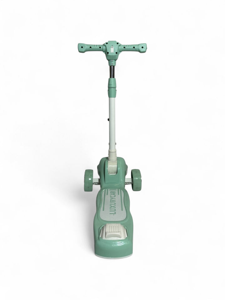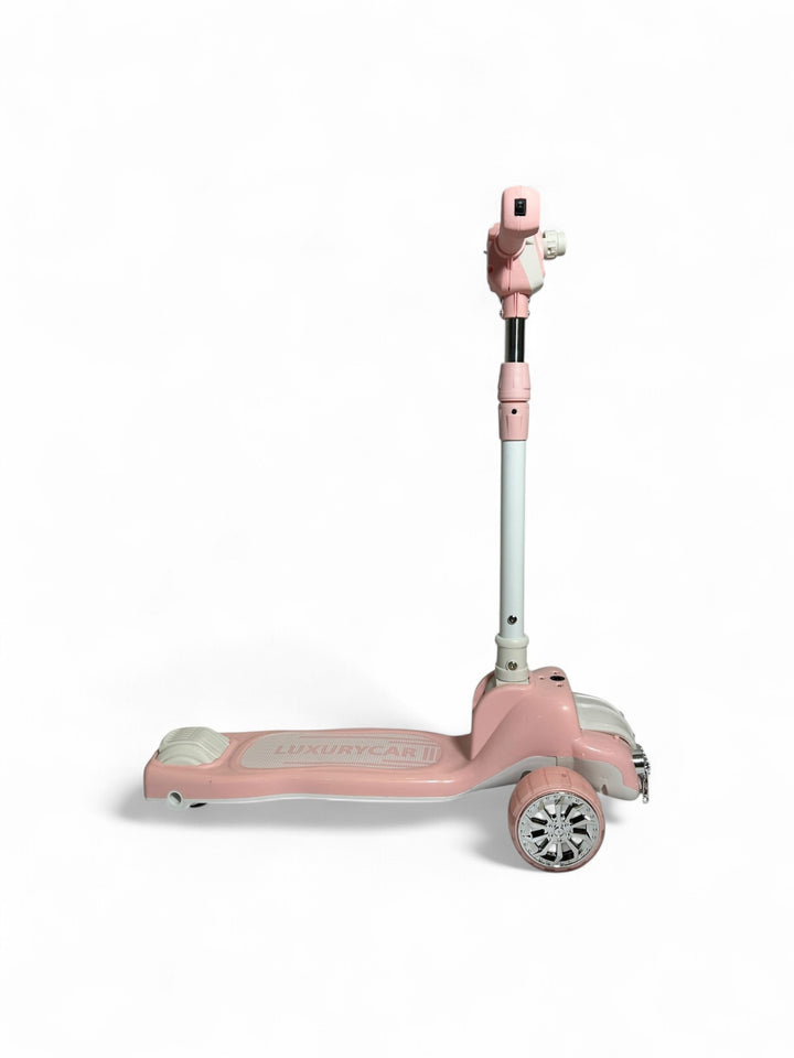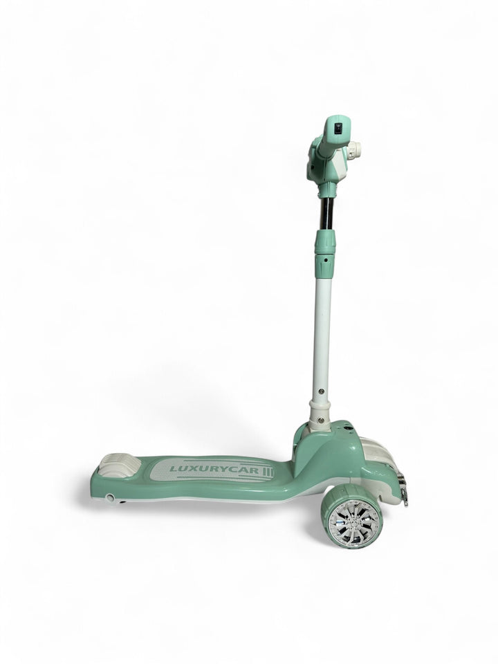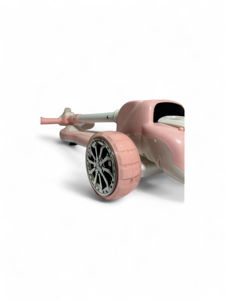 This a three-wheeled kids' scooter with a design resembling a classic car, specifically a Volkswagen Beetle. Features a car-like front, likely inspired by a classic car, and three wheels for stability. Often includes LED light-up wheels and adjustable handlebars to accommodate growing children. Designed with stability in mind, typically featuring a sturdy frame and anti-slip footrests. Suitable for young children, commonly in the 3+age range.