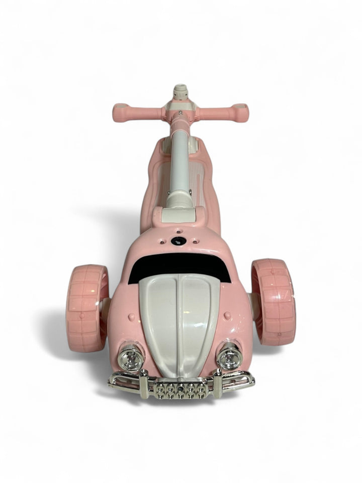 This a three-wheeled kids' scooter with a design resembling a classic car, specifically a Volkswagen Beetle. Features a car-like front, likely...