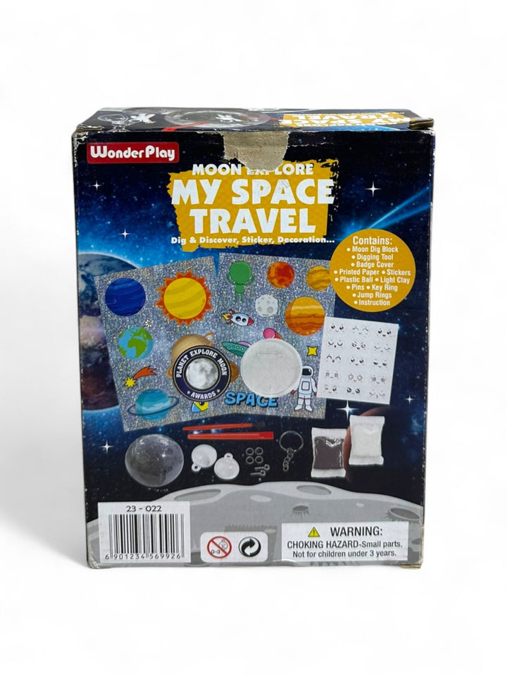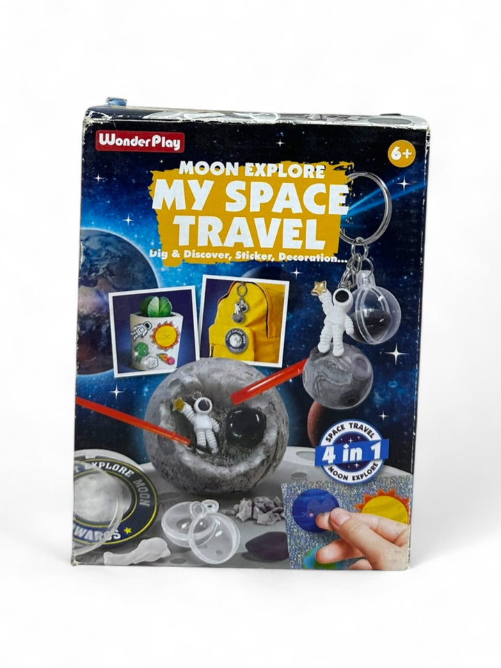 This is a Wonder Play "My Space Travel" 4-in-1 Moon Explore Set, also known as the Sew Star Space Travel 4-in-1 Moon Explore Set. This educational toy kit is designed to spark curiosity and inspire creativity in children interested in space exploration Key features and components of the kit include Moon Black, digging tools, base cover, printed paper, stickers, glow key ring, and a plastic key ring Outer space with planets and astronauts Encourages learning about the moon and beyond through hands-on activities.