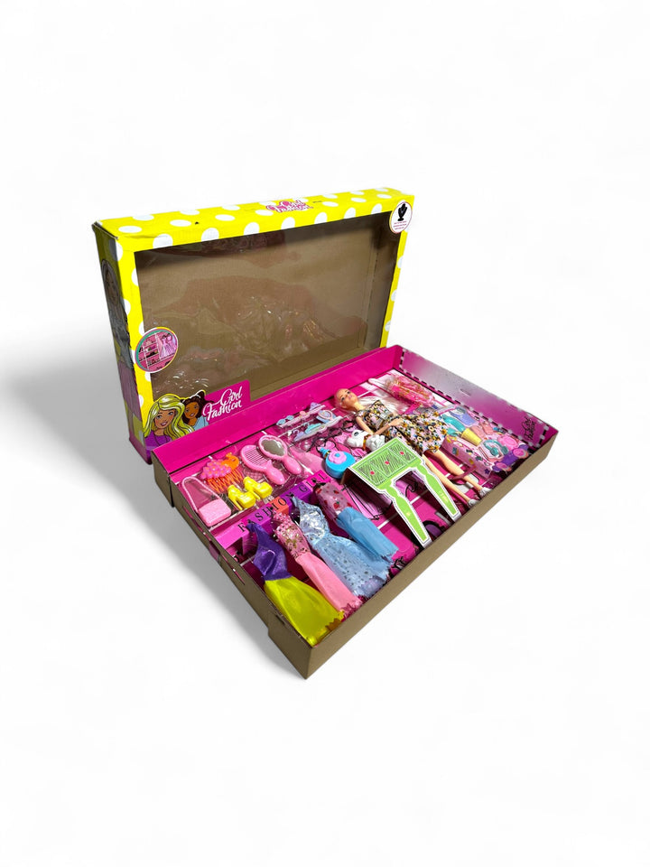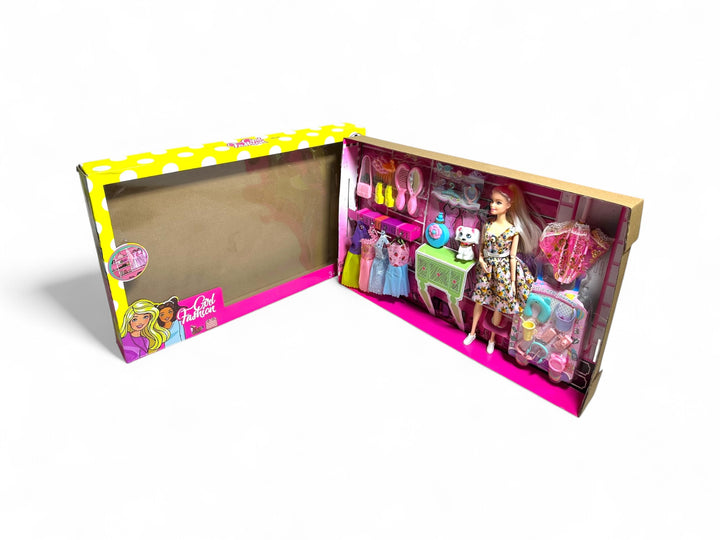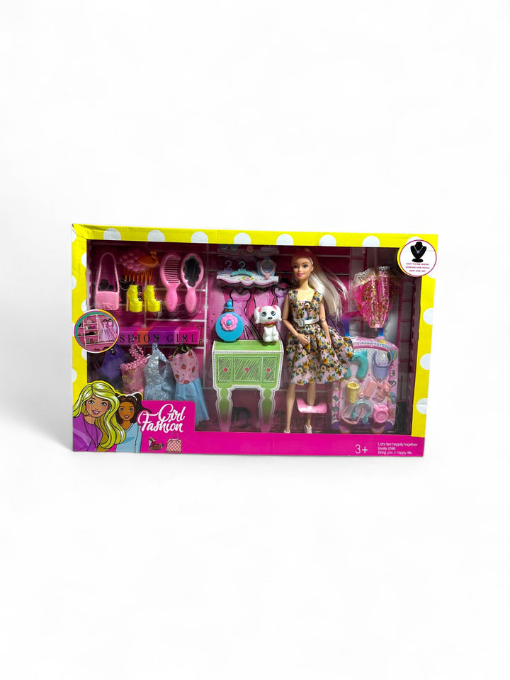 This is a Barbie fashion doll set The set includes a Barbie doll and various accessories like clothes, shoes, bags, mirrors, and a small pet figure. It is marketed for children aged 3 and above The set encourages imaginative play and storytelling through fashion and pet care themes