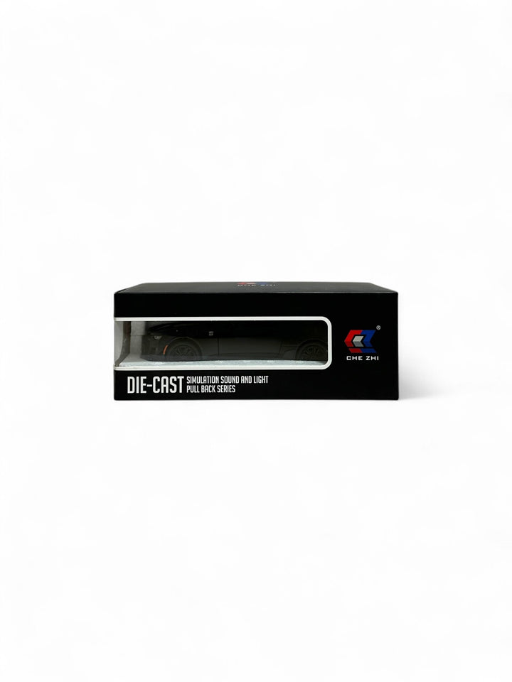 This is a CHE ZHI Die-Cast Model Car from the "Simulation Sound and Light, Pull Back Series This die-cast model includes realistic sound and light effects, a pull-back function for movement, and opening doors, hood, and trunk. It is constructed from durable die-cast metal with plastic parts.