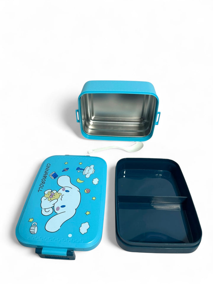 The Cinnamoroll Stainless Metal Lunchbox features a high-quality design with two compartments in the upper section and a single metal compartment in the bottom section, offering organized and durable storage for your meals.