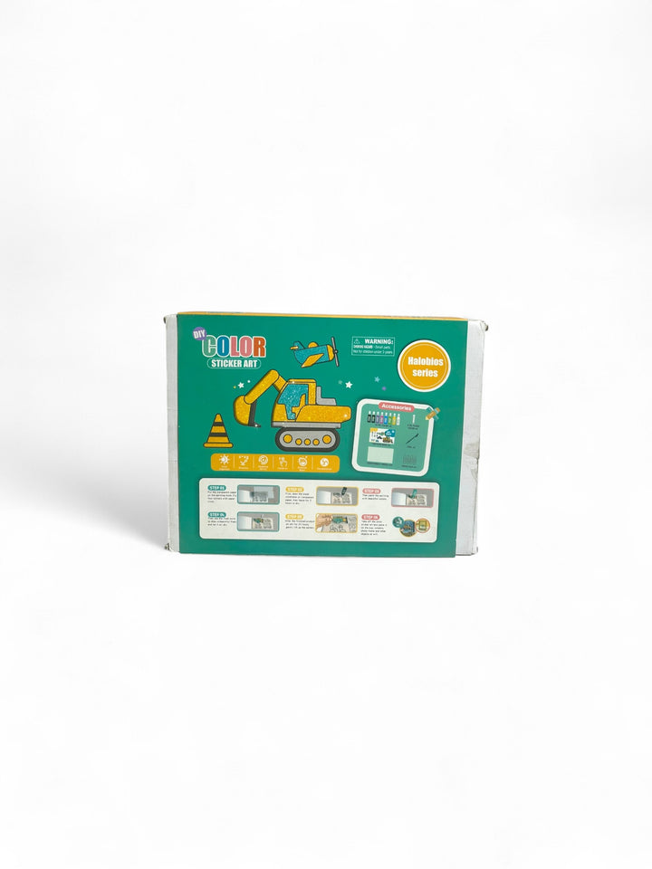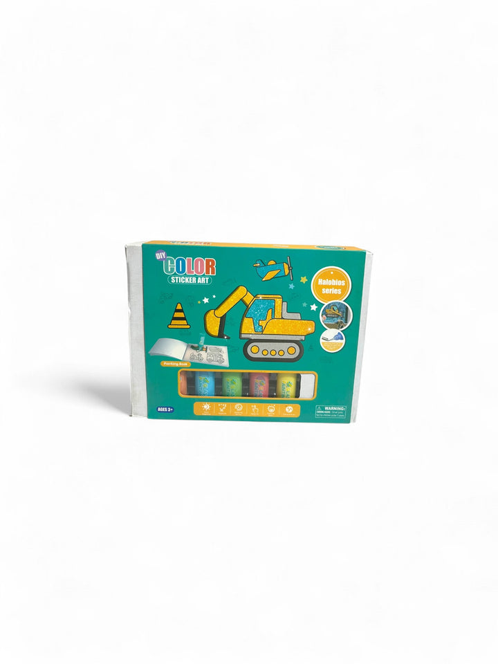 This is a "DIY Color Sticker Art kit This art kit allows children to create colorful sticker art featuring various transportation themes like excavators, as depicted on the box. It includes stickers and presumably colors or paints to fill them in, encouraging creativity and fine motor skills. The kit is designed for children aged 3 and above.