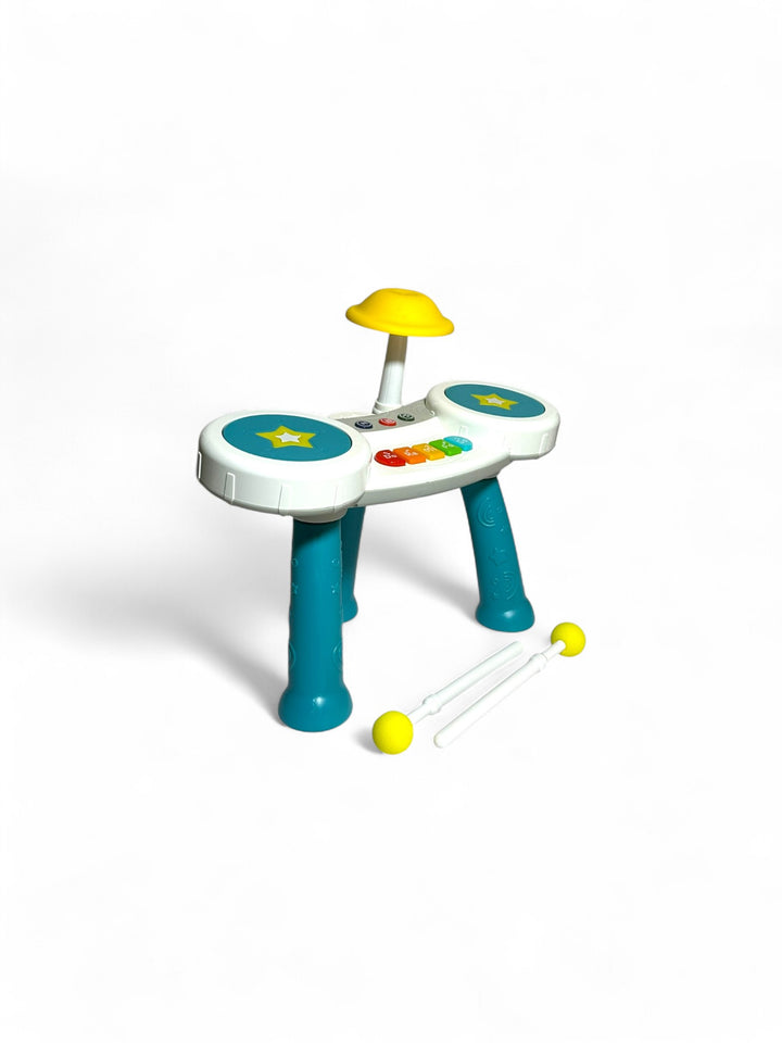 This is a drum kit & piano Set By huanger an early musical educational toy designed for toddlers This 2-in-1 toy combines a keyboard piano and a drum set, offering interactive functions with various sound effects, rhythms, and melodies It aims to enhance hand-eye coordination, develop fine motor skills and auditory sensory abilities, and increase a child's interest in music. It features a colorful and engaging design with lights and sounds to attract and entertain young children. The product is recommended for children aged 18 months and older
