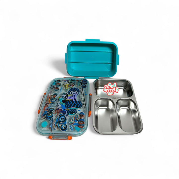 This Extreme Racing 800ML Stainless Metal Lunchbox By Vest is a premium quality 3 individual sealed compartment leaked proof seals suitable for wet not liquids removable inner tray lid clip closure and hinged lid for secure locking storage