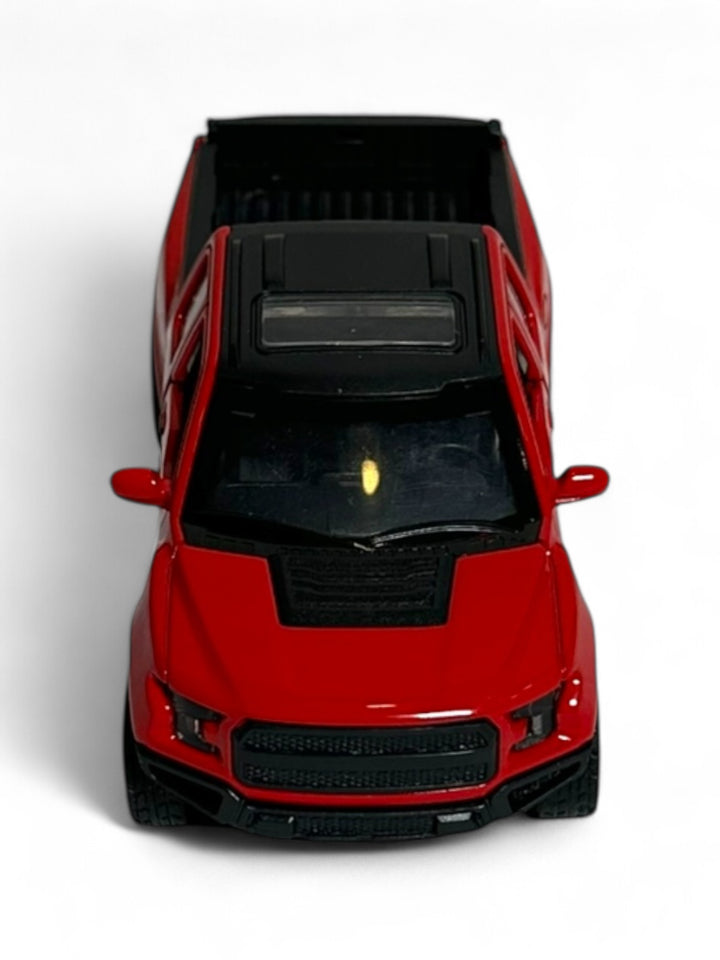 This is a die-cast metal scale model of a ford f 150 raptor pickup truck to pull-back toy car made from metal with plastic details. It features a realistic design, This type of toy often has a pull-back action, allowing it to move forward without batteries. It is marketed as a suitable gift for children aged 3 and up, and also for car enthusiasts and collectors.