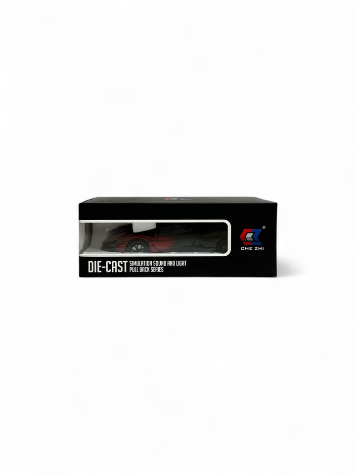 This is a CHE ZHI Die-Cast Model Car from the "Simulation Sound and Light, Pull Back Series This die-cast model includes realistic sound and light effects, a pull-back function for movement, and opening doors, hood, and trunk. It is constructed from durable die-cast metal with plastic parts.