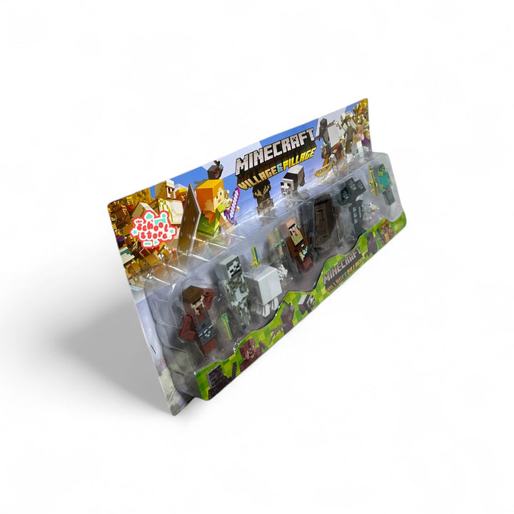 The is a set of Minecraft Village & Pillage action figures. This collectible set offers miniature representations of characters and elements from the popular video game The set includes various figures such as a villager, a panda, and an lllager The figures are designed to mirror the game's iconic blocky aesthetic Great gift for Minecraft fans and kids ages 3+
