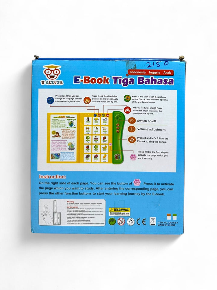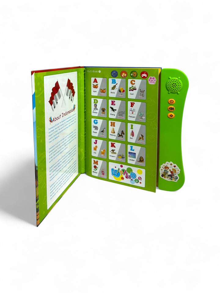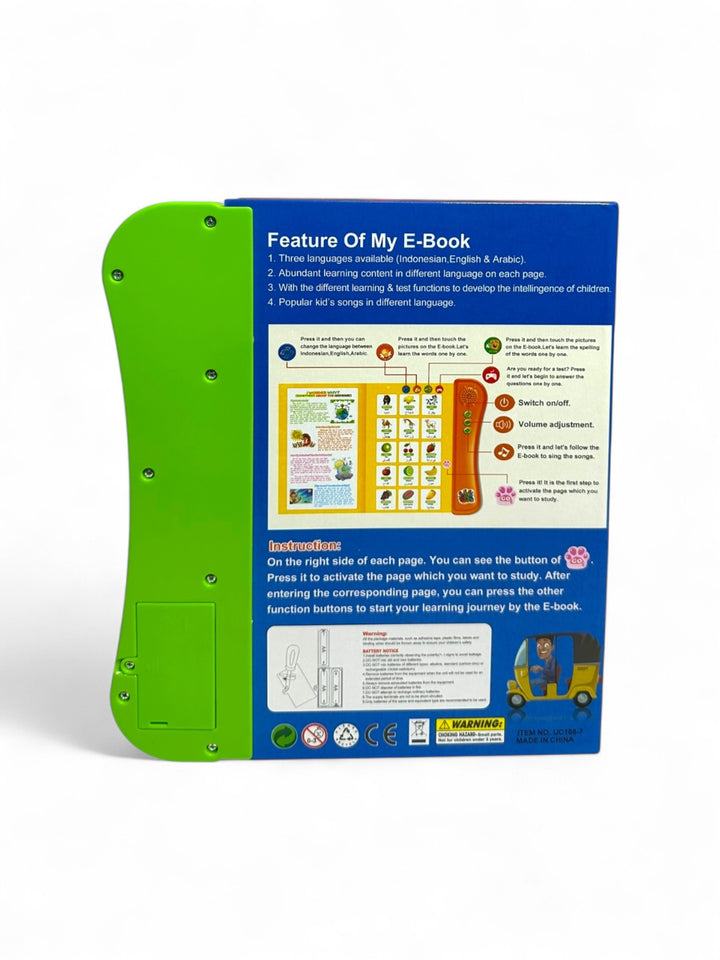 This is an educational "My E-Book" designed for young children (ages 3+) to learn English in an interactive way It includes touch-sensitive pages, sound effects, and a quiz mode to enhance learning. The book covers topics such as alphabets, numbers, animals, fruits, shapes, vehicles, and colors. It aims to improve language skills, hand-eye coordination, and observation abilities through a fun and engaging format.