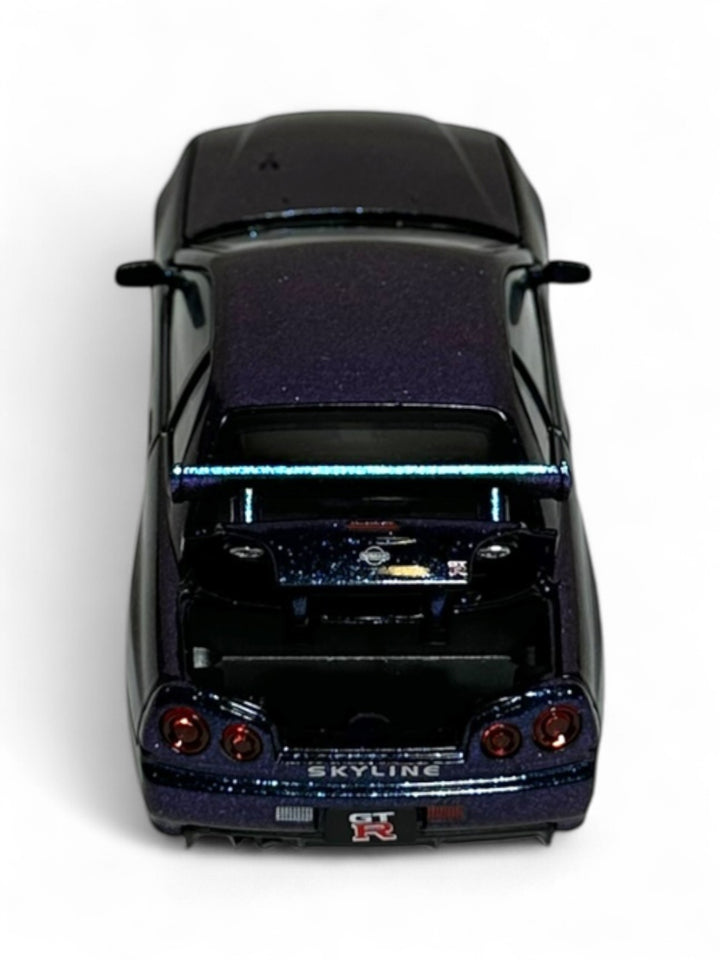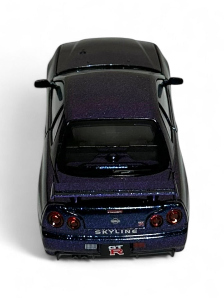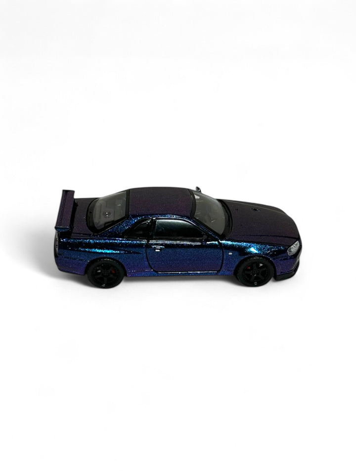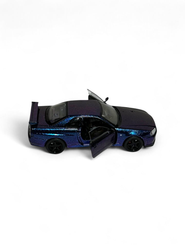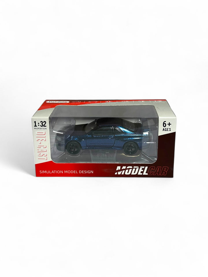 This is a 1:32 scale die-cast model of a Nissan Skyline GT-R R34, likely from the brand Jinlifang. 1:32 scale, meaning the model is 1/32nd the size of the actual car. Made with a metal body and rubber tires, with some opening parts (e.g., doors, hood) Suitable for ages 6 and including those with detailed interiors and engine bays.