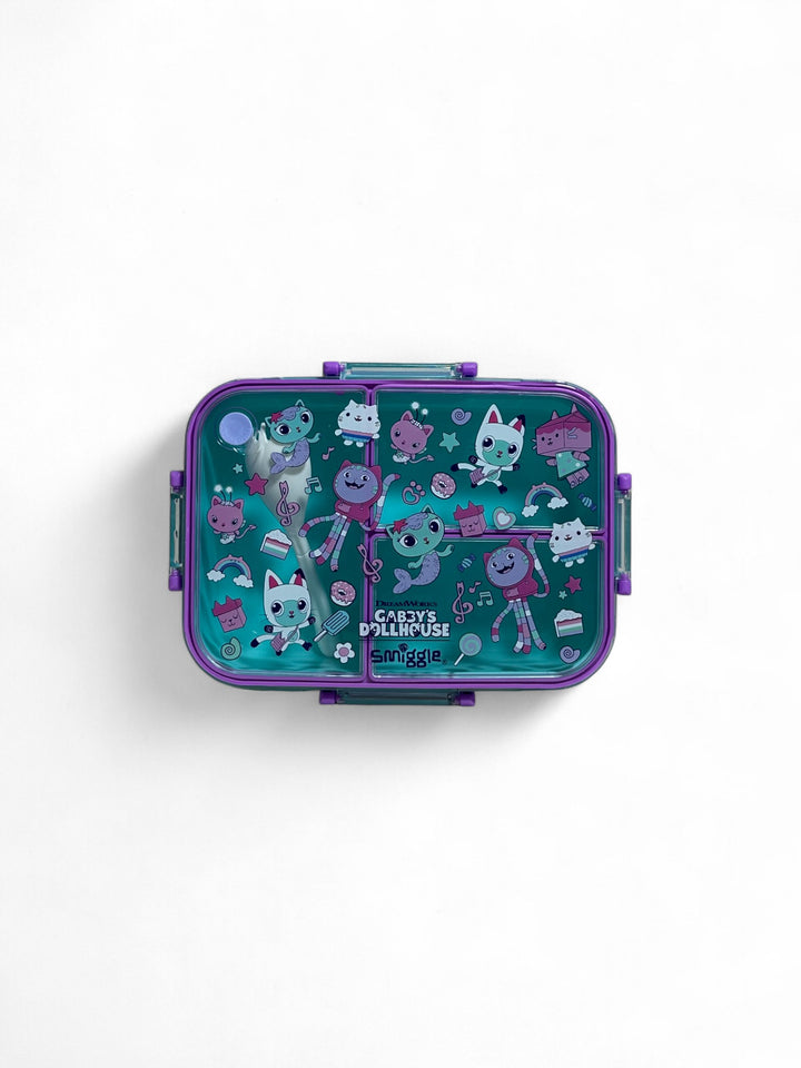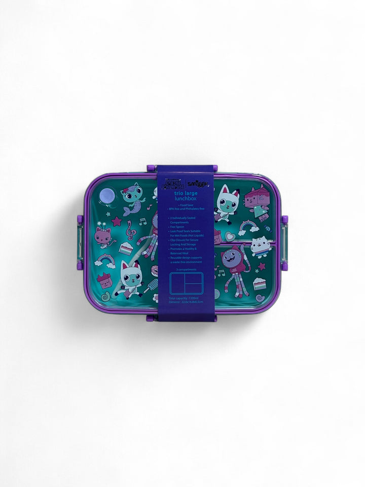Our Original Smiggle Gabby Doll House trio large Lunchbox. Featuring 3 sealed compartments, this reusable design keeps food fresh and leak-proof.