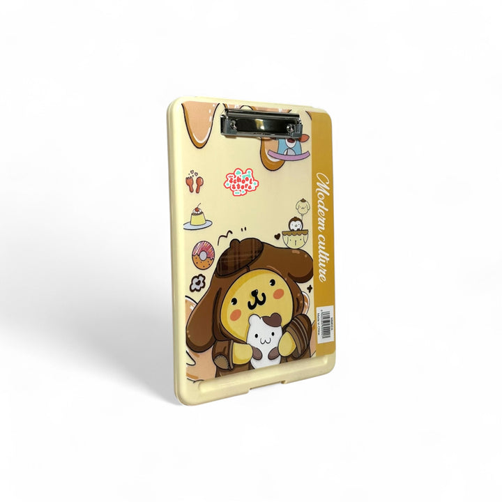 This is a Pompompurin-themed clipboard also known as an exam board or paper board, used for holding paper with a clip The clipboard is designed to be lightweight, and provide a smooth writing surface.