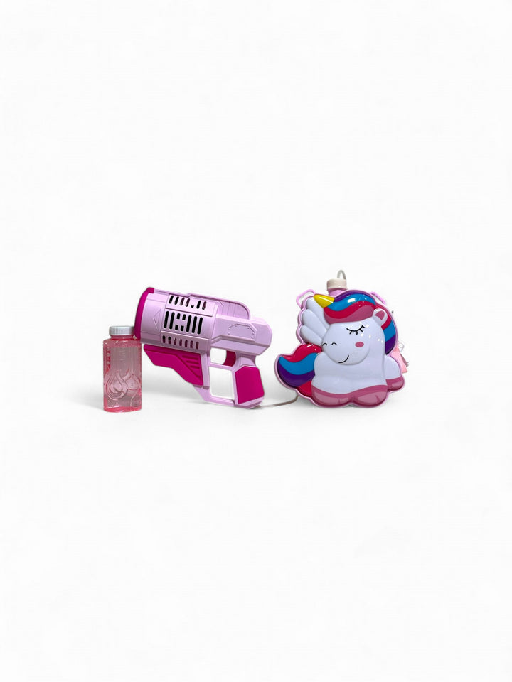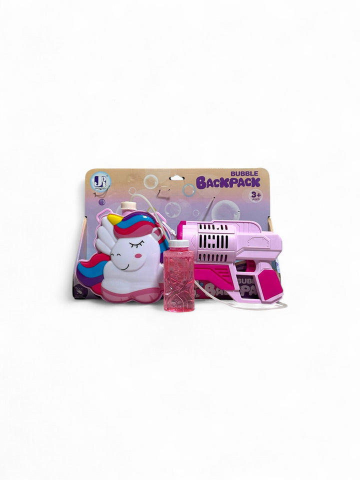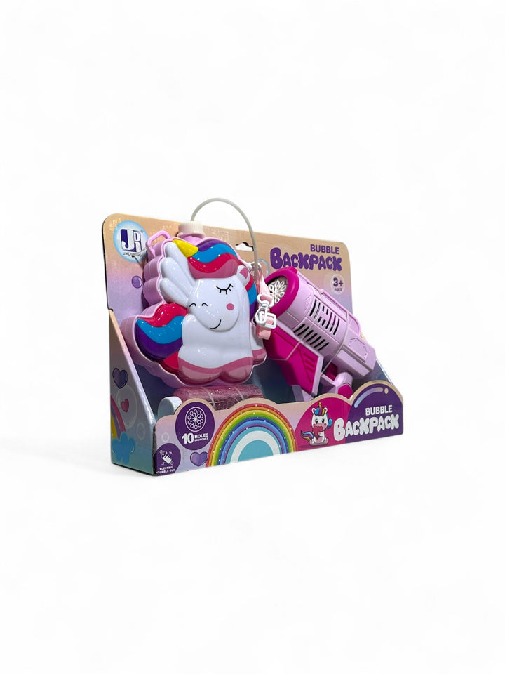 Bring joy to playtime with this unicorn electric bubble gun featuring a super cute unicorn theme that kids will love Includes a colorful easy-to-carry backpack for extended bubble-blowing fun without constant refills Creates a magical bubble experience with vibrant, colorful bubbles that amaze and entertain Powered by batteries for easy portability making it perfect for outdoor adventures, park visits Simple one-button operation allows kids to create a continuous stream of bubbles with ease Designed with child-safe materials, making it suitable for 3+age and safe for toddlers and young children