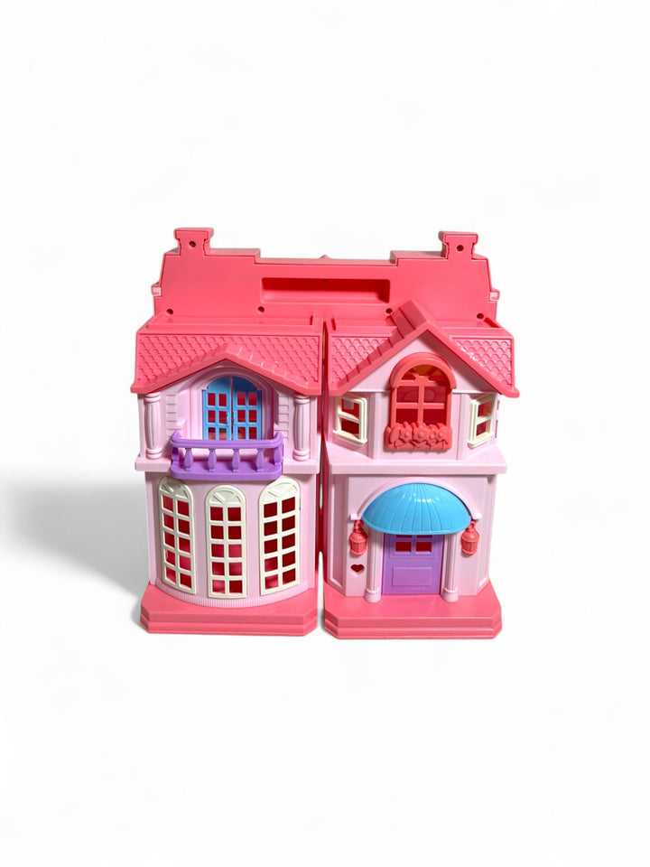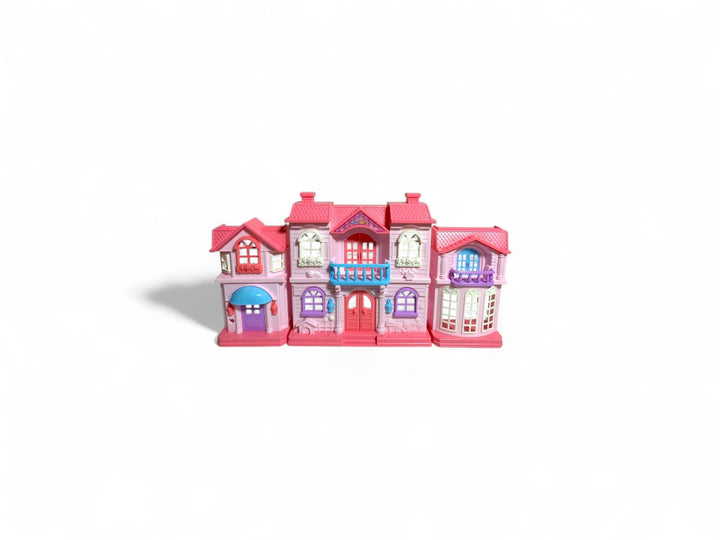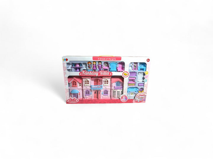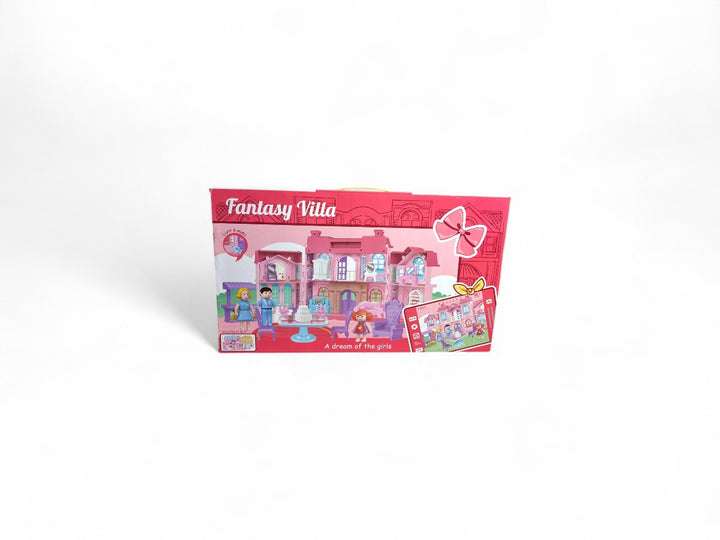 This is a fantasy villa doll house described as "A dream of the girls". This doll house set features multiple rooms and includes dolls and furniture, offering a complete play experience for children The doll house typically includes multiple levels, rooms like a bedroom, living room, and kitchen, along with furniture, dolls, and sometimes lights and sounds fantasy villa doll house